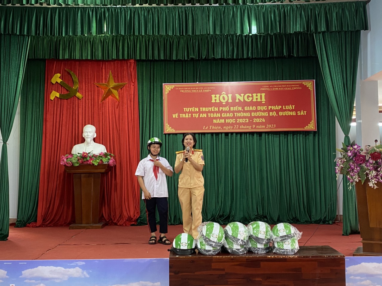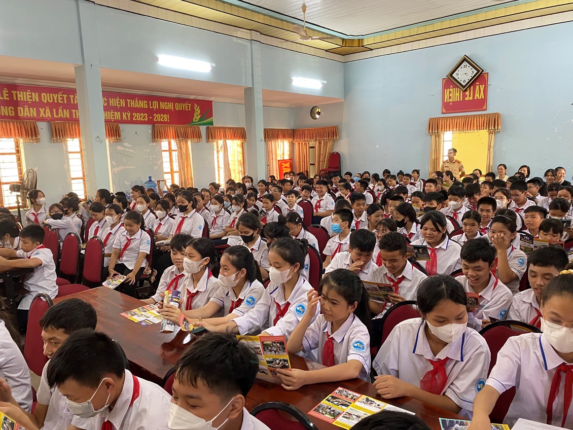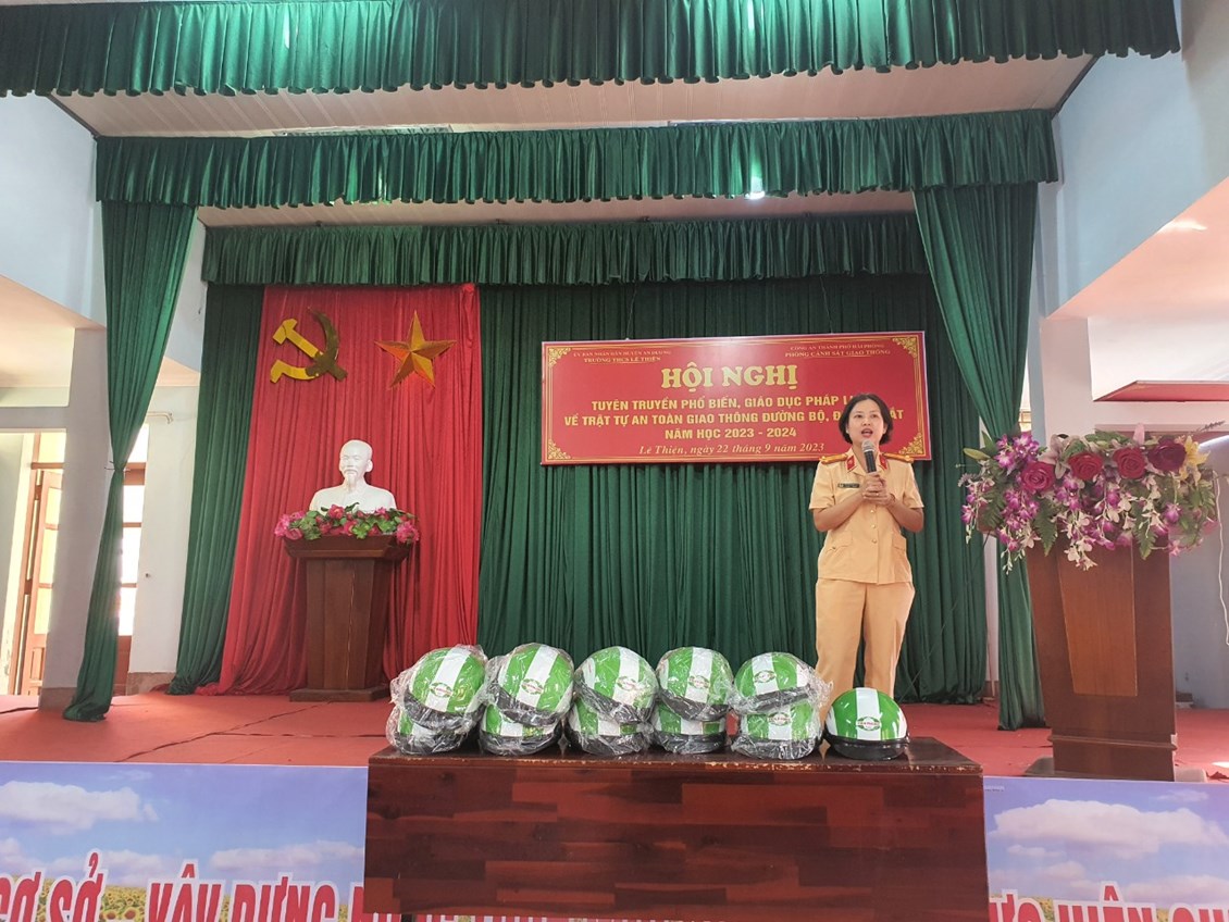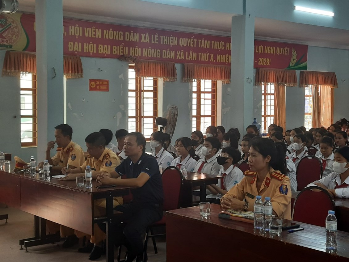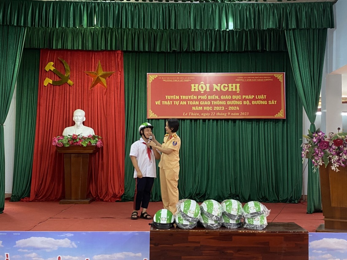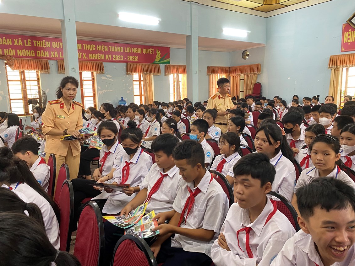Chiều ngày 22/9/2023 tại nhà văn hóa xã Lê Thiện, Trạm cảnh sát giao thông (CSGT) An Hưng - Phòng CSGT đường bộ, đường sắt phối hợp với UBND xã Lê Thiện tổ chức buổi tuyên truyền pháp luật về trật tự an toàn giao thông đường bộ cho các em học sinh trường THCS Lê Thiện.